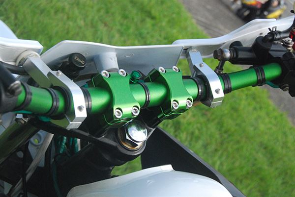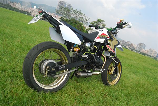 這是哪家大廠新推出的越野車款嗎?相信很多人第一眼看到這輛車也會跟小編有一樣的疑問,小號的角度油箱、集風罩、加高的前土除、拉長的后土除、前後高強度的鋼絲框,以及車上代表熱血、瘋狂ROCKSTAR彩貼,活生生就是一台進口越野車吧?不過仔細一看,引擎上KYMCO的LOGO就能夠驗明它的身分了,經過車主巧思打造出來的這輛KTR 150已經脫離原本偏向於滑胎風格的外表,蛻變成一輛能夠上山下海的越野車,更值得一提的就是排氣管,車主特別將它改裝成底排,手工的前段搭配進口蠍子管,高扭力的單缸聲浪用蠍子管呈現起來更為爆力。