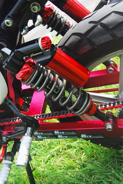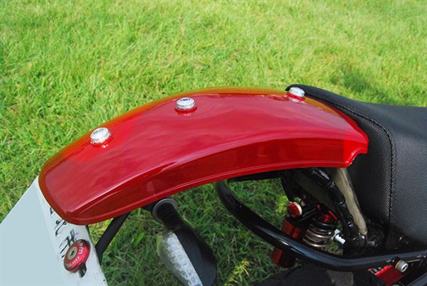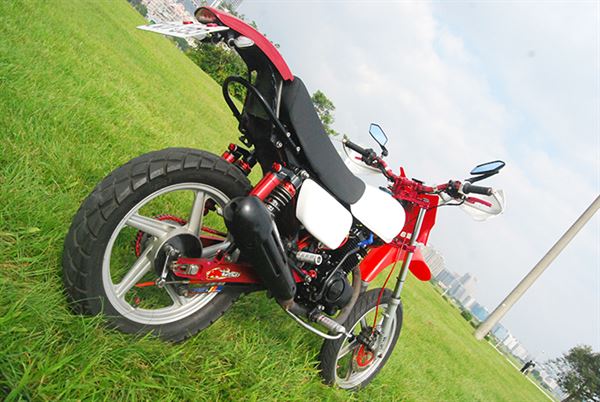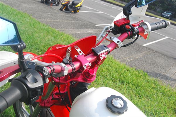 改車就是要改出自己的風格,不管別人怎麼說自己喜歡就好,就是這麼簡單直接的信念,車主打造出了這台他所愛的KTR150。看似簡單的紅白車體配色卻能夠抓住眾人眼球,讓人不經停下腳步仔細的端倪這部車,車主身為越野風格的愛好者,改裝的號碼牌以及搶眼的前土除當然不可少,世冠三角台搭配勁前叉讓車輛在激烈操駕的時候更穩定。當然在越野場地上沒人是不摔車的,這時封閉式護弓便起作用了,摔車的同時完美保護檔車最重要的離合器拉桿以及煞車拉桿,讓車主可以立馬坐上戰駒重新開始,手工打造的支架讓原廠後土除可以跟改裝精品相比擬,更值得一提的是車主為了保持低調,特別不更換排氣管只改裝引擎內部與化油器,讓原廠管也能擁有凶猛的聲浪。