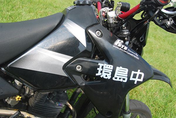 完美移植上黃牌DRZ全套車殼,集風罩上的環島中大字證明了這輛車的戰績。