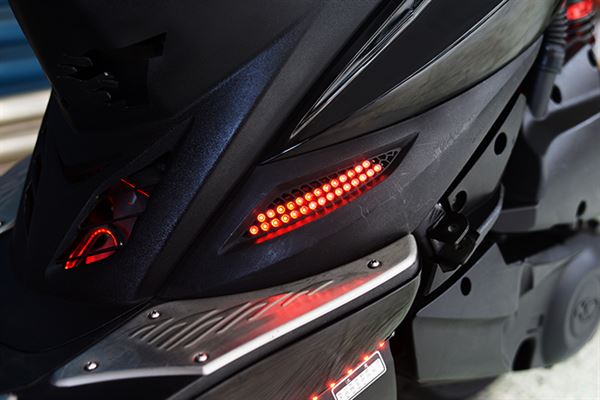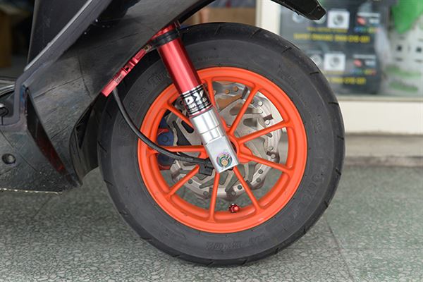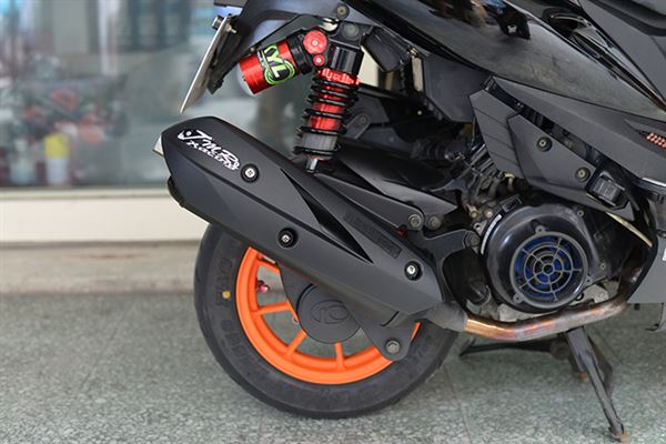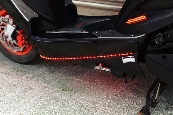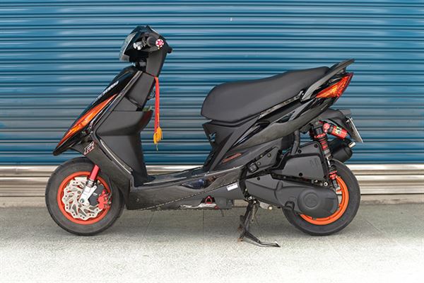 先天體質非常優的光陽VJR,不論在加速或是輕巧方面都有很棒的評價,但是專屬改裝品卻一直處於較為缺乏的狀態。車主非常用心地在車子本體安裝了KYL全車系車底燈,並且還訂做了客製化的燈眉,羨煞許多同是VJR的玩。而為了配合橘色車燈,還特意將避震器還是燈殼、輪框色系統一化,選擇橘紅色為主配色,在陽光下的對比顯得更加亮眼,在黑夜中更是黑橘紅閃耀。由於動力上沒有較暴力的改裝,所以在輸出中等動力的同時,車主選用了散熱極佳的RPM碟盤,讓制動力能夠發揮完整效果。