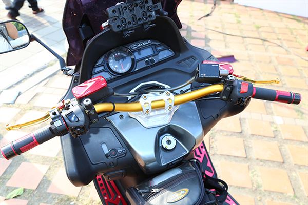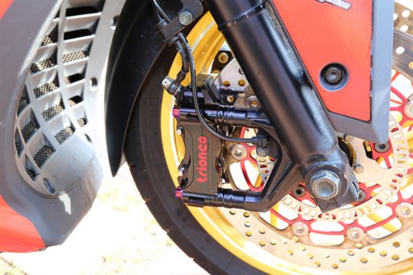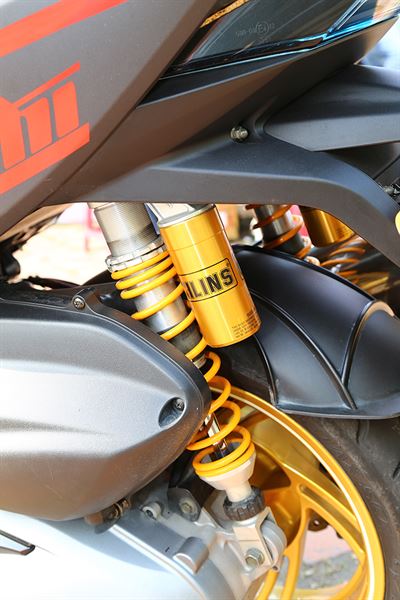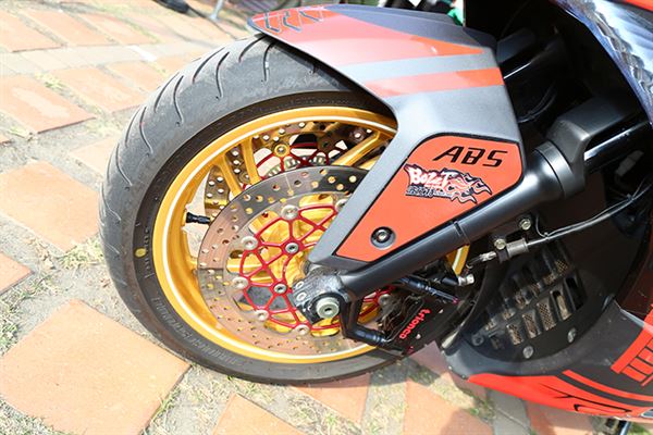 在懸吊系統上,黃牌大羊因為車重的關係,加上擁有400㏄的動力,操控顯得相當重要,後避震改裝頂級部品強化,制動方面更是使用兩顆川歐的輻射對四卡鉗加持,配合原來的ABS系統,騎乘更加安全。此外自行設計的整體紅黑金配色更是令人難忘。
