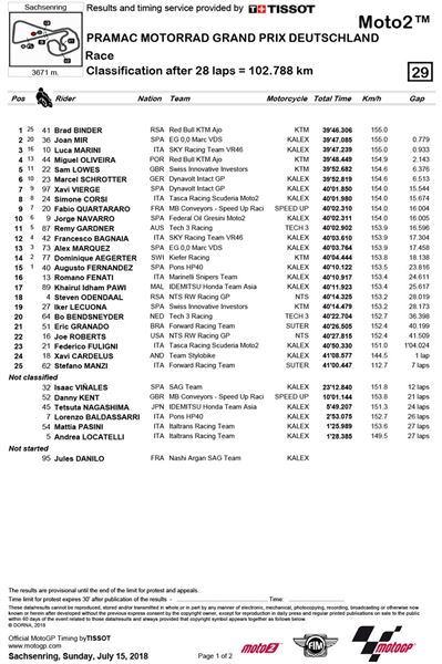 Brad Binder在德國站中奪下他出道Moto2之後第一場勝利,打敗了已經獲得自己最快單圈成績的Joan Mir (EG 0,0 Marc VDS) ,第三名則是Luca Marini (Sky Racing Team VR46) ,這也是他第一次站上頒獎台