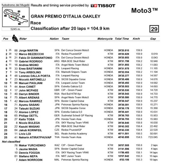 Moto3:義大利站正賽成績
