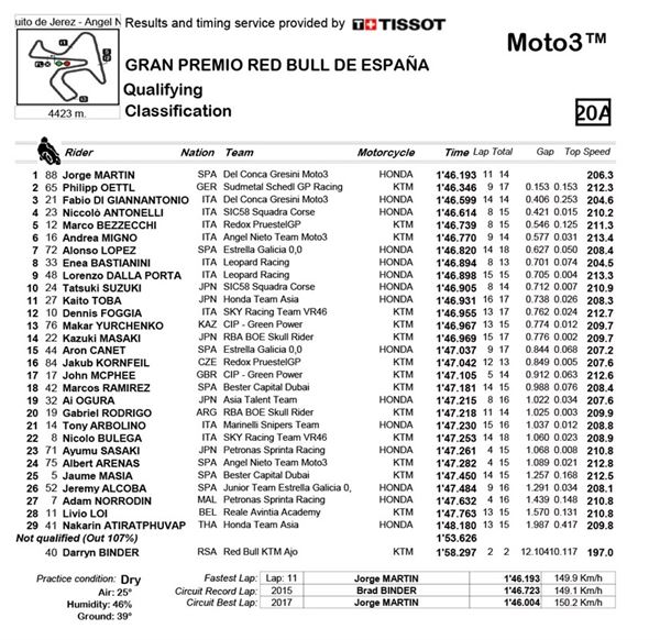 目前於Moto3的年度冠軍積分榜領先的Jorge Martin在西班牙站中奪下個人生涯第11次的竿位,身為西班牙籍的賽車手,這個結果不會太出人意表,第二名則是Philipp Oettl,差距只有0.153,第三名則是Jorge Martin的隊友Fabio Di Giannantonio,這三位將會在明天的正賽中頭排起跑