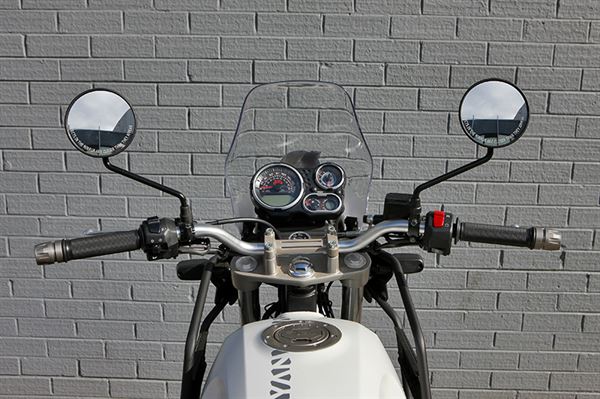 高挑的風鏡與小圓後照鏡提供長途公路騎乘的基本機能