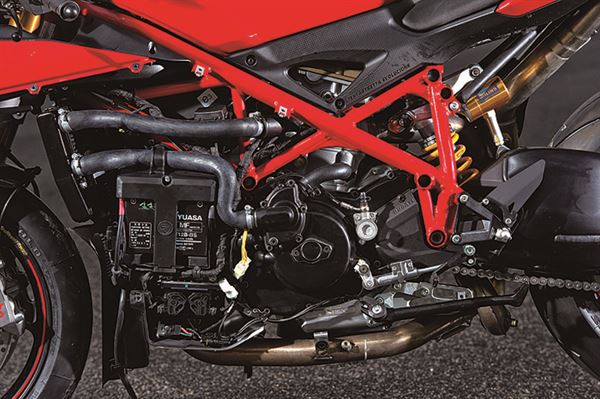 最後是增加滑動式離合器以及增添2.5公升的鋁製油箱,當你用膝蓋夾緊的時候可以感覺到油箱變得比較大,鋁製油箱從刻意不做彩繪處裡的中央帶狀線條就能瞧出端倪。在許多車款上這樣的配置會變成是種設計的倒退,但在1198 S上卻是因為過於纖細而造成不好夾緊的錯誤(更不用說才15.5公升的油箱容量),在重煞時更顯得膝蓋沒有任何摩擦力。