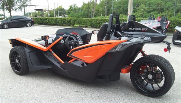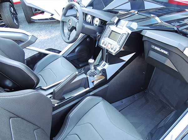雖然是三輪車,但是操作明顯與市場上我們熟悉的三輪大不相同,即便是同樣類汽車設計的CAN-AM也跟SLINGSHOT大不相同,在方向控制的部分使用動力方向盤,幾乎可以說是一部汽車。內裝的布局用了許多直線營造超跑風格,未來感十足,但就是沒有太多關於車輛設定的按鍵,跑車座椅的外觀也是以直線切割出造型,不過看上去似乎沒有很舒適的樣子?
