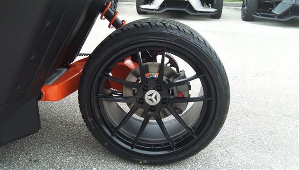 前二後一的輪胎配置,並且是前後配的,單一的後輪作為驅動輪,在尺寸上來到驚人的305/30/R20,對比前輪225/45/R18明顯大了許多。單搖臂的設計搭配皮帶終傳也是令人驚奇。
