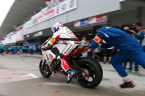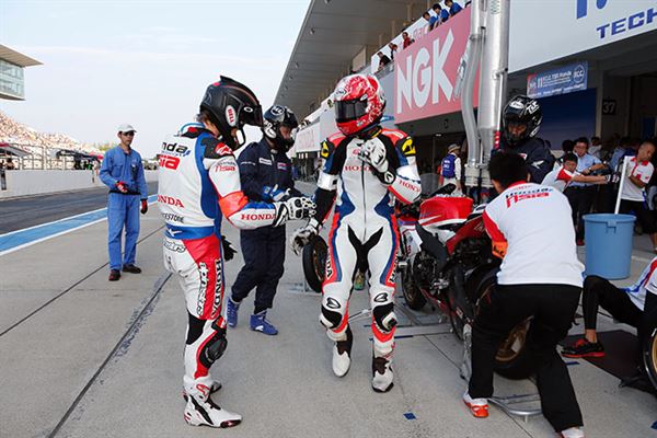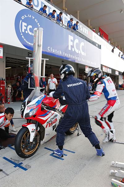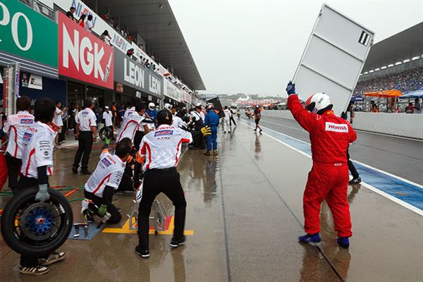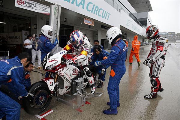不過選手們倒是不為雨勢所動,在早先官方測試中遇上下雨,速度依然飛快的秋吉耕佑選手發下豪語,要將冠軍獎盃獻給F.C.C.車隊,的確從這幾個月的幾次測試乃至於排位賽看下來,HONDA陣營『F.C.C. TSR Honda』的戰力完全不下於常勝軍『MuSASHi RT HARC-PRO』,只是流年不力未能撐完全場。
