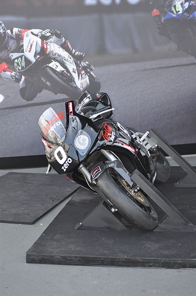 看到選手們如行雲流水般地過彎,好像非常簡單似的,看看這輛傾斜固定住的賽車,騎上去就會知道光要維持姿勢就有多累人,更何況還要承受高速下產生的G力,不過照片中這位阿桑似乎感覺還挺樂在其中的。