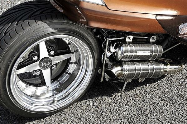使用汽車的輪框和碳纖維排氣管,上方的是空氣濾心