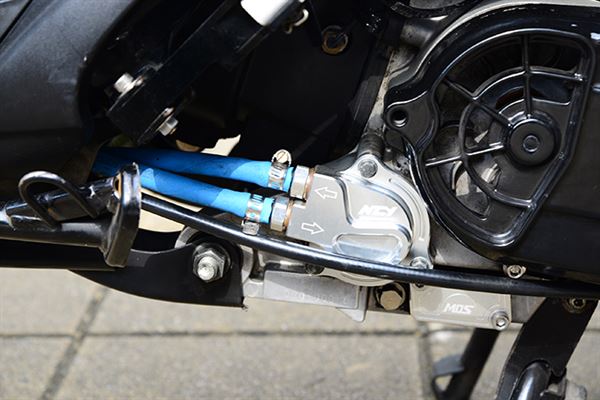 在細拍到車體下方時,發現有個NCY的冷卻循環系統,經過尋問才知道,原來這台車已經改為擁有61缸動力,並具備油冷系統的動力機器。雖然Address車系,並非以性能著稱,但擁有優異的體質,足以應付不同程度的暴力改裝。