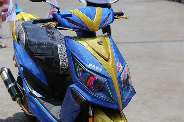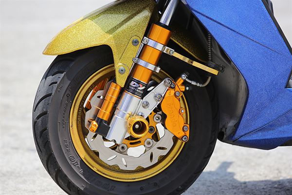 這輛JET POWER125採用亮麗的金蔥烤漆來呈現全車的特色,使人第一眼看見時便能迅速被吸引,改裝品的選配也同樣跟著車身配色,可以想像車主對愛車的用心。雖然此車烤漆相比一般視覺爆改車,是屬於較為簡單的配色,但搭配上改裝品後反而更有一體性,吸引力當然也是加對的倍增,車主除了在烤漆上下足功夫,對於安全性能也相當注重,前總成以DY的改裝前叉為本體,搭載上Frando卡鉗以及嘉大型碟盤,讓制動性能大幅增加,而避震器更選用D2可調雙掛瓶,讓騎乘時可以依需求馬上調整,穩定度也得到一定程度的保證。
