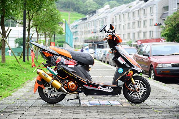 整台車以黑色系為基調,車殼上頭的彩繪則是充滿日式風格,取材自品牌牛仔褲上的「地藏小王」圖騰,隨處可見的日文字,車後還掛個鯉魚旗隨風飄盪呢。