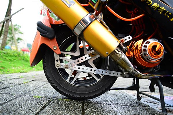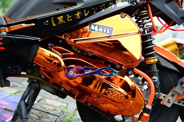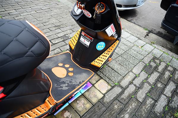 除了黑色之外,外露的機械部品多選用金色系,包括板井的加速排氣管,RPM鈦合金散熱蓋、腳踏板也是改為金色,再加上後照鏡、中控鎖蓋、前掛勾等,都能看到亮彩的金色,或是接近的橘色。