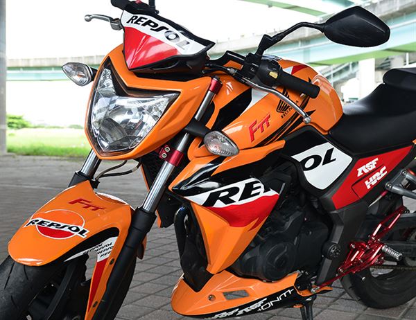改裝車改的和別人不一樣,走出自己獨有的車輛風格才有其中的價值,以力豹仕為主題的車身彩貼,從懸吊由FTT永輪車業特調的前叉加上DNM掛瓶單槍避震,為了強化動力改裝aRacer全取代電腦和WRRP漸擴卡夢水滴管,訴求著性能和操控上的突破。