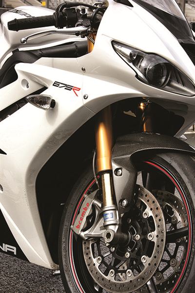 車廠基本上並不考慮賽車的事務,不過個人倒是有想要拿675來參賽。不過之後Triumph參加了SBK賽事,而且還上了頒獎台,由此證明了他們的性能,獲得了比問世當初更高的評價。配備著前後Ohlins避震器、Brembo一體成型煞車卡鉗、黃金懸吊的675R問世,這麼難得的試乘機會,當然不能錯過,於是便趕往了葡萄牙。Portimao賽道圖和實際賽道感覺差很大,賽道實際狀況是高低起伏頗大的設計。和其他四缸600cc比較起來,675的低速扭力營造出不少優勢,轉速容易提升,扭力輸出順暢。