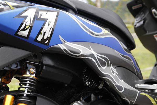火焰紋的彩繪貼,搭配藍色車殼相當亮眼