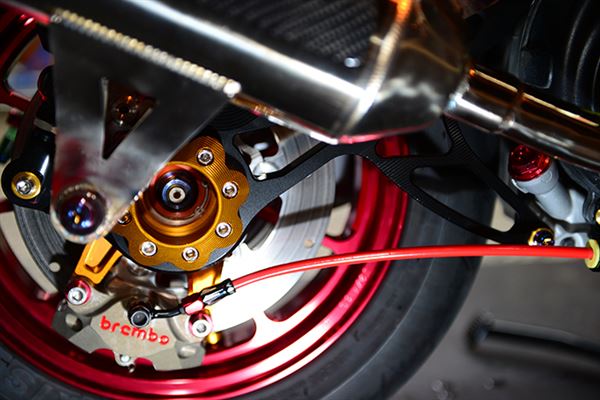 DY前避震器、Brembo限量版黑底紅字卡鉗、鯊魚工廠前鍛造框、K-tech後避震、RPM後鍛造框、Brembo CNC對二卡鉗、SPEED1 CNC後搖臂、狂熱者運動版浮動碟盤、加路達金屬油管、隼芯3D CNC散熱蓋、城北專利桶身側繞白鐵管
