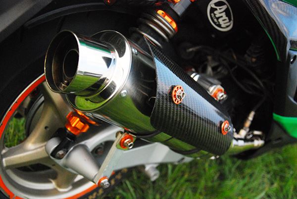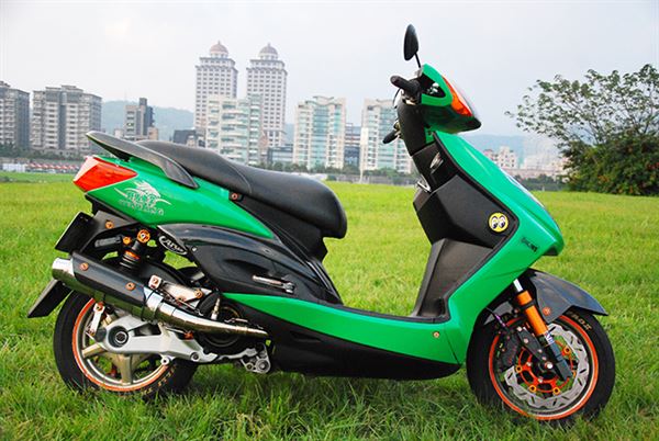 來自野馬車業的這輛YAMAHA Cygnus-X,亮眼的蘋果綠烤漆搭配上橘金色的改裝部品,讓人不經聯想到夕陽落下的大草原。秉持者性能至上的精神,車主在內部改裝上下的功夫可不比外觀少,將引擎強化到58半、800條搭配32mm節流閥,並加上E2電腦,將原本的點火時間重新設定轉速限制也解除,因應加速的需求換上HPM漸擴全段排氣管,讓排氣流速降低回壓力更強,想當然爾如果沒有強大的制動任誰也不敢將油門一拜,Frando卡鉗搭配上NCY紀念版碟盤大量的磨擦面積讓這輛戰駒在動靜之中自由切換,K1掛瓶避震器跟DY競技版前叉也大大提升了騎乘時的路感,在高速情況下也不會感到不安心。