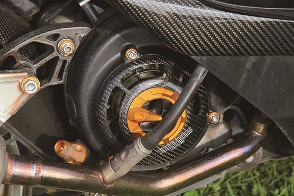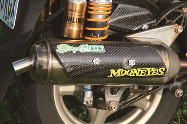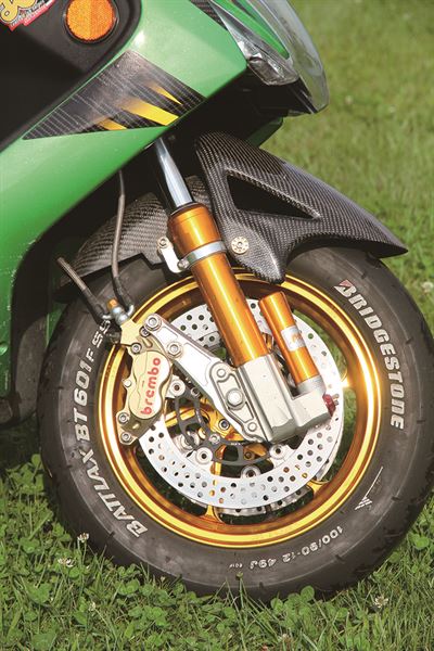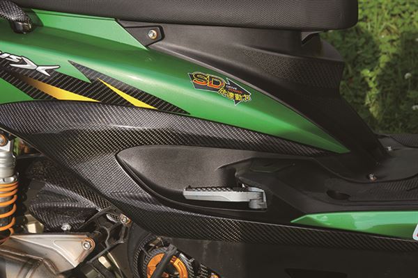 這輛由疾輪車業所改裝的三代目,全車採用高質感的豔綠塗裝,並搭配上碳纖維樣式的貼紙、車殼,完全沒有違和感,琳瑯滿目的部品更使車輛增添了不少金屬性能感,猶如全身添滿了神裝的遊戲角色,不管遇到什麼對手都能輕易擊敗。黃金色的機械部品使性能大幅提升,無論是在輕量化、運動性,還是穩定性、制動性,都有優秀的表現。它最緊繃的地方莫過於前總成,RPM雙碟版的鍛造框搭配雙組NCY N12碟盤、兩組Brembo CNC對四卡鉗。