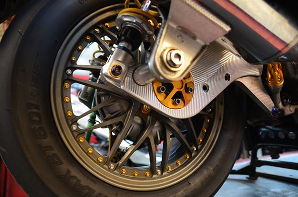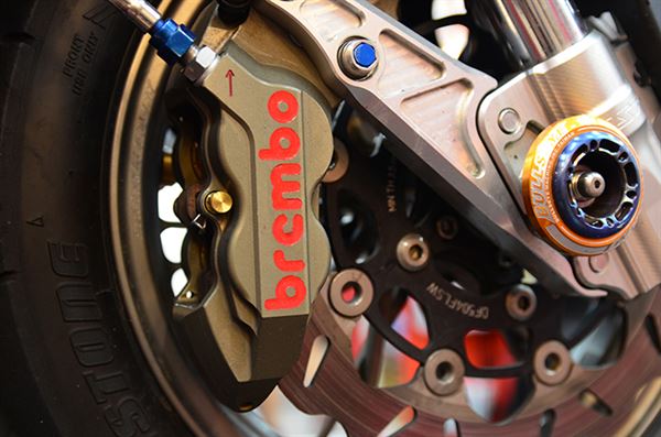 這輛改裝車車主充分表達運動風格特性,並將多數改裝部品改裝到極致,不論是動力、制動性能或是操控能力,因應車主對性能上的要求從改裝部品就能看出端倪,前面部份鍛造鯊框是標準配備,MSP的UDDSF前倒叉加上Brembo的對四卡鉗,內側還有Ohlins防甩頭,擁有強大動力操控性能就靠這些緊繃的改裝部品來強化了。