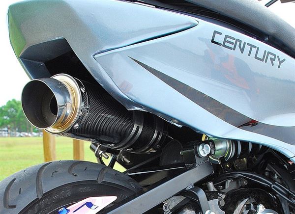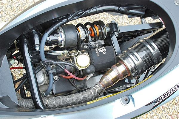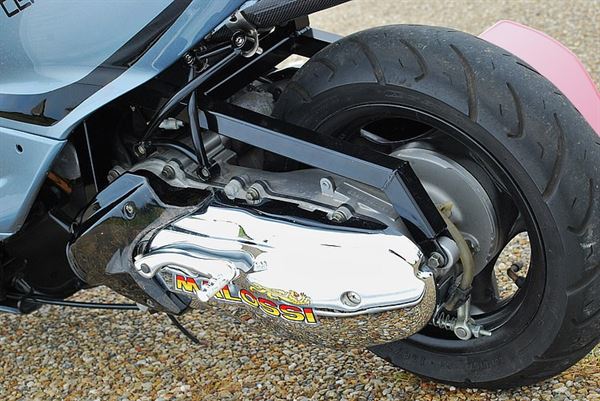 座墊底下的中出式碳纖維排氣管是在這種類型車款上相當少見的改裝方式