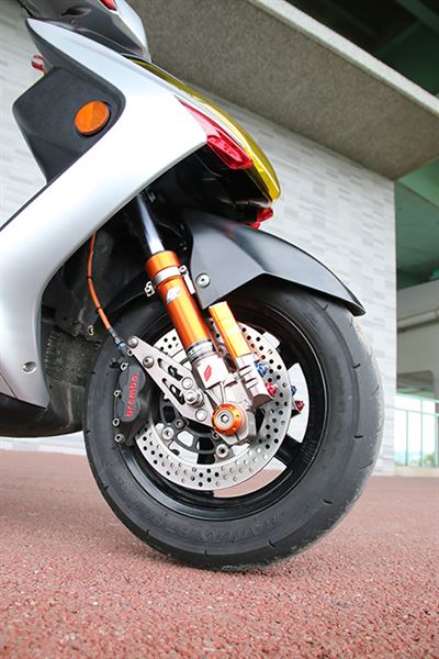 前GJMS PCD 2000 pro避震器、後GJMS GP6 H/L避震器、Brembo N12碟盤、Codo 66缸1200條套件、G Stone 14×38 輕量齒輪、唭哩岸車業傳動組