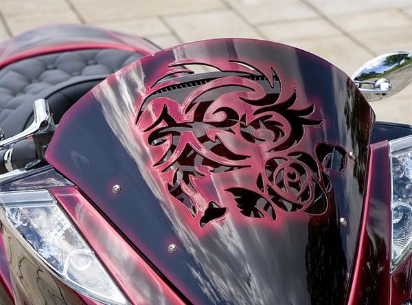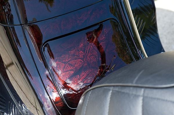 鏤空雕刻的酒紅色風鏡也在整台車身上起到畫龍點睛的效果