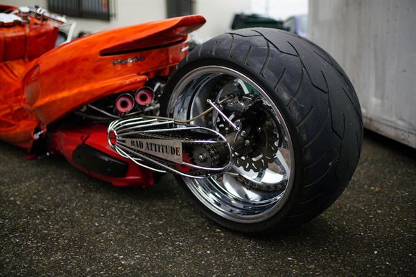 前後輪框都換上汽車用的產品,後輪甚至使用了300的爆規產品,車身整體採用橘色來提升一體感