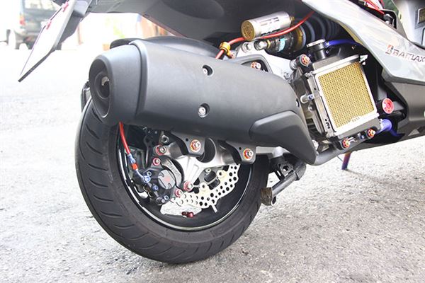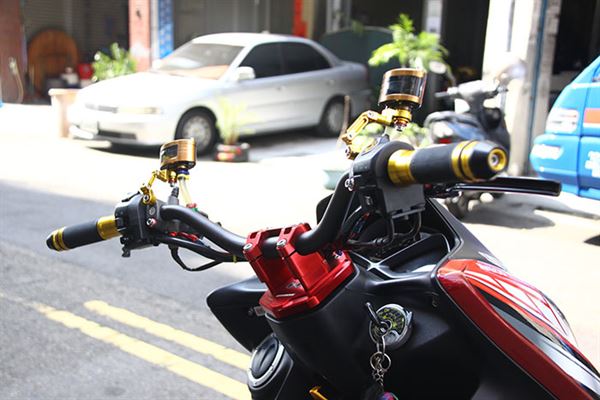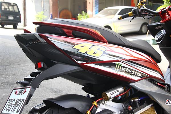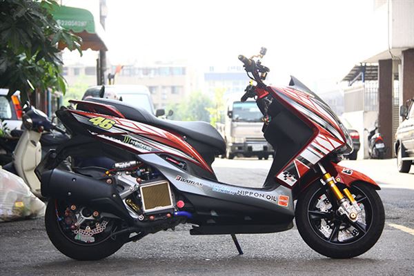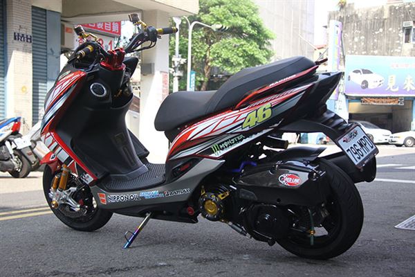 此輛精裝SMAX車上已經看不到「旅」的元素,從頭到尾徹底變身!使用的全是最頂尖的改裝部品!從制動到懸吊,都是最緊繃的配備,搭上YAMAHA廠隊在MotoGP的塗裝彩貼,配合原本紅色的車色,小地方也以碳纖維紋路作配搭,感覺別有一番風味,相信看到此車的人,都不會再覺得他是一輛旅跑,而是徹徹底底的運動車款!