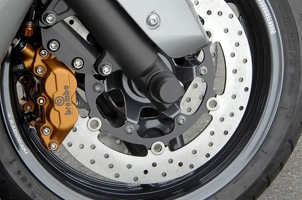 在極簡風格的前輪起到畫龍點睛效用的就是BREMBO的煞車卡鉗了