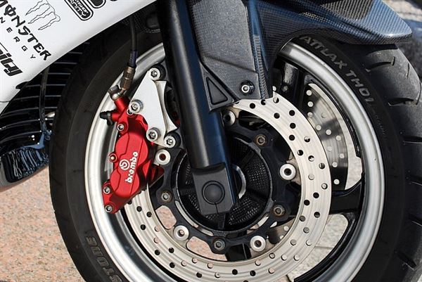 原廠碟盤上使用的是BREMBO的煞車卡鉗,紅色的卡鉗座在亮白的車身上起到畫龍點睛的作用