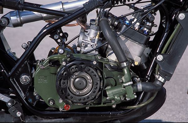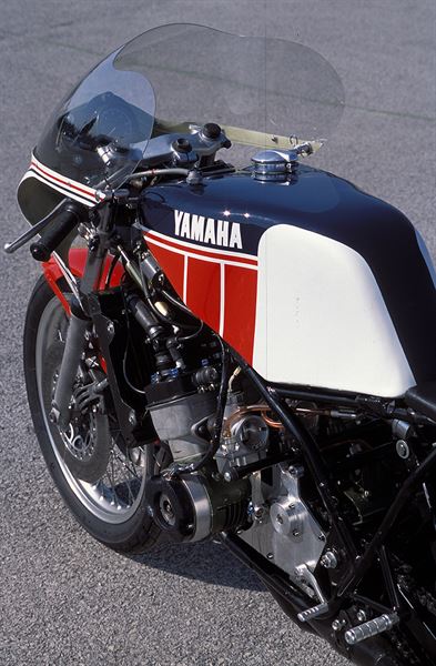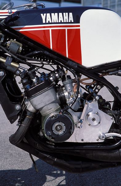 所以當時到底YAMAHA如何靠著TZ350奪下總冠軍的呢?其實一開始YAMAHA只顧著想改裝一台能奪得冠軍的500㏄賽車,但沒想到在改裝引擎行程尺寸時的突發奇想,便把這主意也放到原有的TZ350上。當然除了改裝引擎中的缸徑行程外,YAMAHA還特別從日本訂購TD2曲軸並重新設計車架,更請YAMAHA歐洲區專門研發引擎的工程團隊們為這台未來冠軍車在引擎上多做調整和改裝,經過種種的研發改裝後,YAMAHA終於打造出一台與眾不同的究極TZ350。搭載著水冷二行程直列三缸的引擎,排氣量為345㏄,缸徑行程為54×50.2㎜,轉速達到12,300rpm時能輸出87匹馬力。